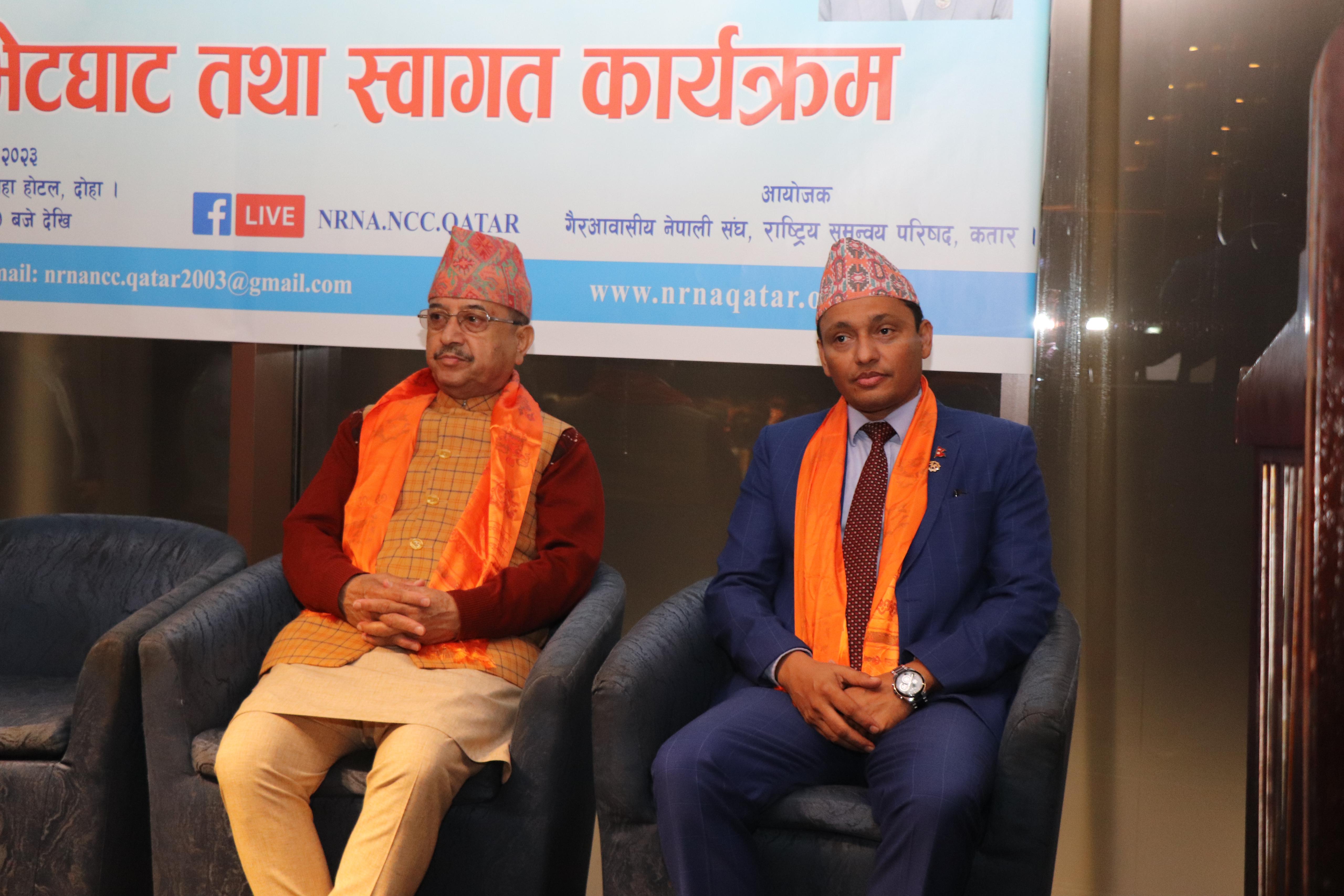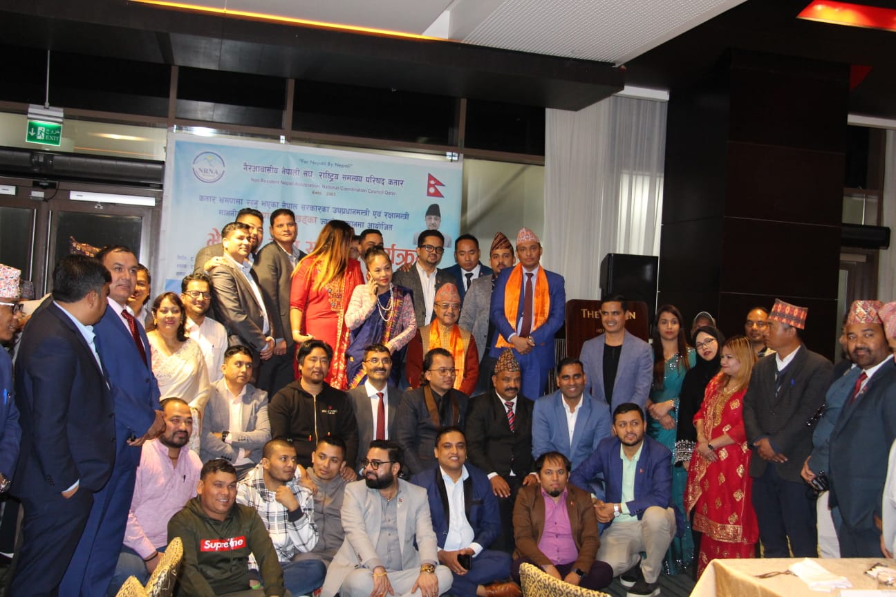 नेपाल सरकारका उपप्रधानमन्त्री एवं रक्षामन्त्री श्री पूर्णबहादुर खड्का ज्यू संयुक्त राष्ट्र संघको आयोजनामा घानामा भएको अन्तर्राष्ट्रिय शान्ति स्थापना सम्बन्धी संयुक्त राष्ट्रसंघीय सम्मेलनमा भाग लिएर नेपाल फर्कने क्रममा कतार भ्रमणमा रहनुभएको अवसरमा गैरआवासीय नेपाली संघ, राष्ट्रिय समन्वय परिषद कतार द्वारा माननीय उपप्रधानमन्त्री ज्यू लगायत भ्रमणदलमा रहनुभएका ब्यक्तित्वहरुको सम्मानमा आयोजित भेटघाट तथा स्वागत कार्यक्रम मा उपस्थित माननीय उपप्रधानमन्त्री एवं रक्षामन्त्री श्री पूर्णबहादुर खड्का ज्यू, नेपाली राजदुतावास कतारका महामहिम राजदुत ज्यू , भ्रमणदलका बिशिस्ट सदस्य ज्यूहरु, नेपाली राजदुताबासका अधिकारी ज्यूहरु, गैरआवासीय नेपाली संघ अन्तरास्ट्रिय समन्वय परिषदका पदाधिकारी तथा पूर्व पधाधिकारी ज्यूहरु, आइसीसी सदस्य ज्युहरु, बैचारिक सस्थाका अध्यक्ष तथा प्रतिनिधि ज्युहरु, प्रदेश समन्वय परिषद कतारका अध्यक्ष तथा प्रतिनिधि ज्यूहरु, जिल्लासस्थाहरु बाट पाल्नु भएका अध्यक्ष तथा प्रतिनिधि ज्यूहरु, विभिन्न संघ सस्था बाट पाल्नु भएका अध्यक्ष तथा प्रतिनिधि ज्यूहरु, सामाजिक अभियन्ता ज्युहरु, पत्रकार मित्रहरु लगायत कार्यक्रम मा उपस्थित सबैलाई धन्यवाद तथा आभार व्यक्त गर्दछौ ।